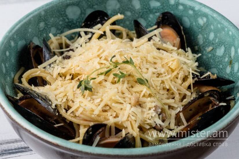 Спагеті, тушковані у масляно-винному соусі на основі вершкового масла та білого вина, з дрібно нарізаною ріпчастою цибулею, часником, перцем чилі та каперсами, з додаванням обсмажених морепродуктів: восьминіг бебі, мідії в мушлях, кільця кальмара атлантичний. Прикрашається тертим сиром Пармезан та обсмаженими хвостами тигрової креветки.