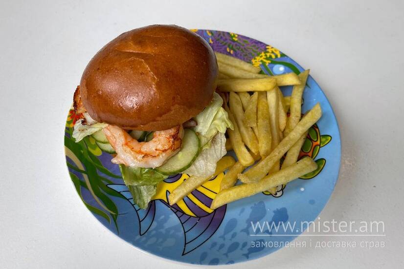 Міні-бургер з обсмаженими хвостами тигрових креветок, соусом діжон, салатом айсберг та свіжим огірком. Подаємо з картопляними діпами.