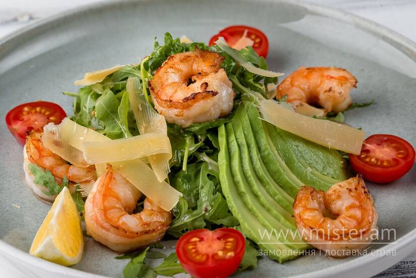 Свіжа руккола з томатами чері та авокадо в поєднанні з хвостами креветок, обсмаженими на вершковому маслі з тим`яном, часником та білим вином. Салат заправляється соусом Діжон на основі французької гірчиці, прикрашається слайсами сиру Пармезан та лимоном.