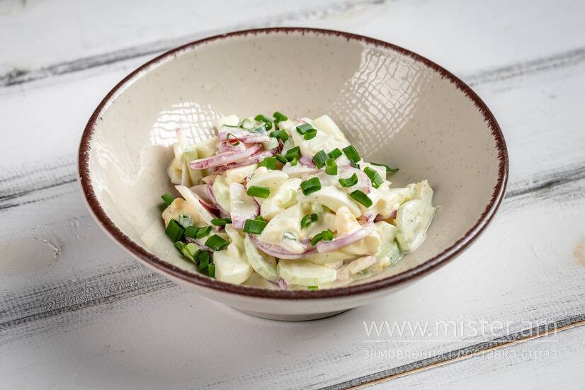 Чорноморка Весняний салат з молодого редису, огірка, зеленої цибулі та яйця зі сметаною