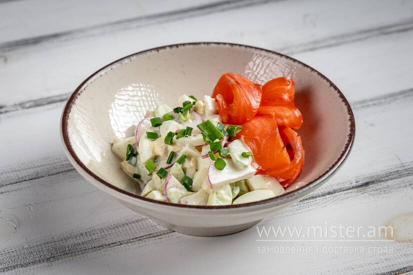 Свіжий легкий салат із молодого редису та огірка, відварним яйцем, сметаною, лососем слабої солі та зеленою цибулею.