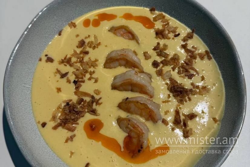 Крем-суп на основі картоплі, цибулі, моркви, часнику, сиру, рибного бульйону, молока, вершків та вершкового масла, зі смаженими креветками. Прикрашається смаженою цибулею та кольоровою олією.