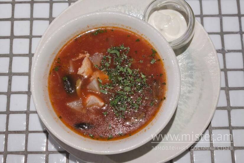 Суп на основі рибного бульйону та томатів з міксом м`яса риби: осетр, лосось та судак, з додаванням маринованих огірків, ріпчастої цибулі, каперсів, маслин та лимону. Подається зі сметаною.