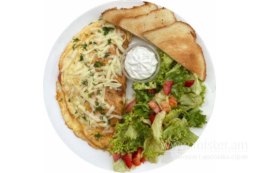 Яйця, баликові ковбаски, помідори, салат, соус медово-гірчичний, моцарелла, грінки, крем-сир.