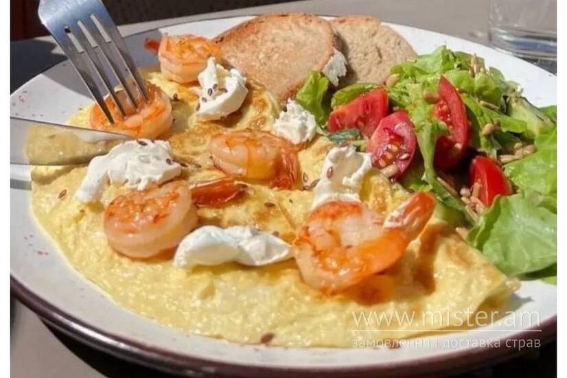 Омлет з трьох яєць, креветки, крем сир, огірок, помідор, салат, льон, насіння соняшника, соус кунжутний, хліб житній.