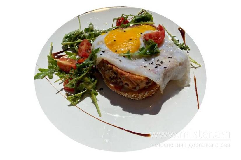 Булка бріош, сир тостерний Чеддер, шинка, яйце смажене, помідор Чері, рукола.