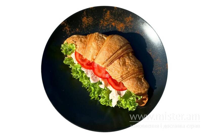 Круасан, листя салату, соус Цезар, куряча грудка, помідор.