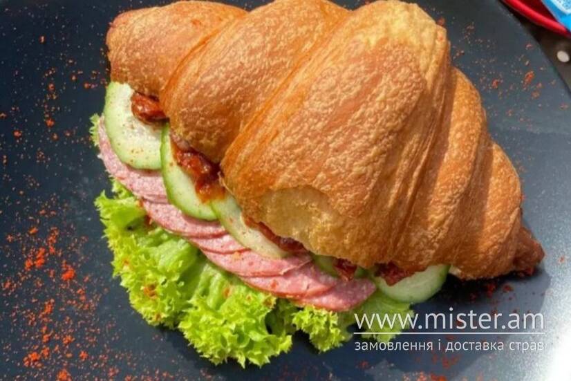 Круасан, соус тартар, салямі, в`ялений томат, огірок свіжий, листя салату.