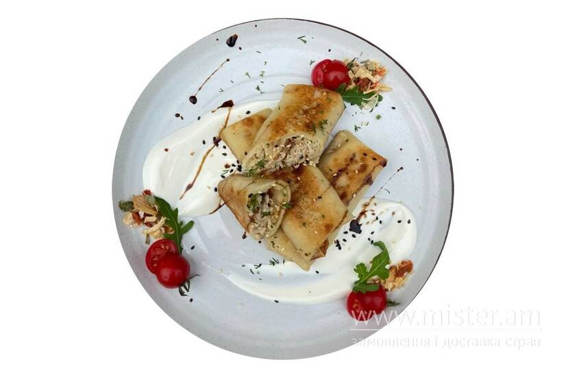Млинці зі свинним фаршем, подаються зі сметаною.