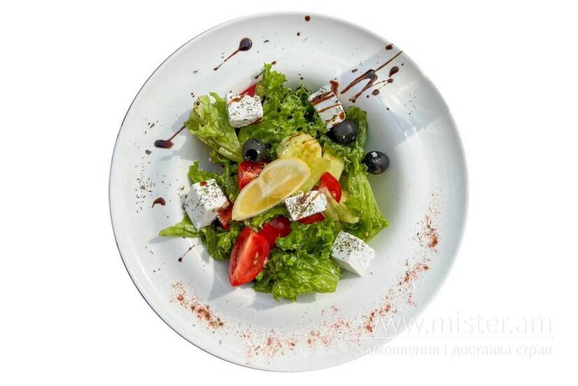 Салат, огірок, помідор, перець болгарський, маслини, фета, цибуля Марс, оливкова олія.