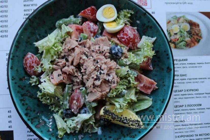 Салат, перець болгарський, помідор, стручкова квасоля, тунець, яйце перепелине, маслини, соус.