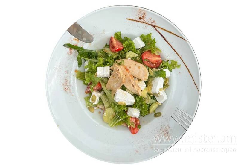 Салат, огірок, фета, куряча грудинка, помідори Чері, насіння гарбуза, соус медово-гірчичний.