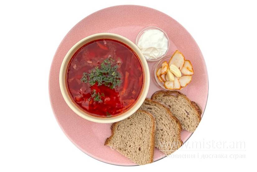 М'ясо свинини, буряк, морква, капуста, цибуля, картопля, масло, спеції, часник.
