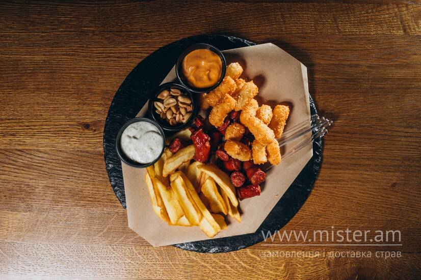 Сирні палички, картопля фрі, чіпси, ковбаски, соус часниковий, соус медово-гірчичний.