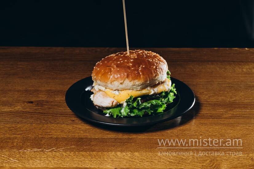 Булочка бургерна, курка, бекон в спеціях, голандський сир, листя салату, соус часниковий.
