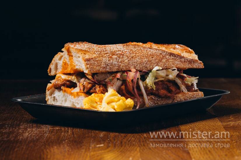Багет чіабата, соус BBQ Cola, соус спайсі айолі, рване м`ясо свинини, маринована цибуля, мариновані огірки, айсберг.