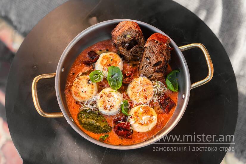 Пряні солоні сирники з кропом, базиліком та мʼятою томлені в пательні з томатами пелаті, цибулькою порей та свіжим базиліком, вершками, чилі слайсами, песто, в`яленими томатами. Подаються з мікрогріном, пармезаном та гречаним хлібчиком натертим часничком.