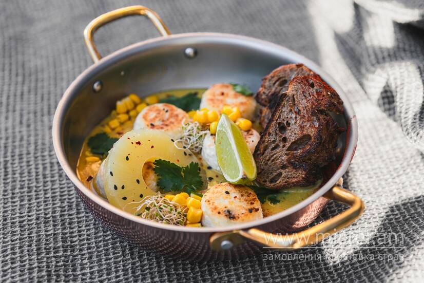 Пряні солоні сирники з кропом, базиліком та мʼятою, обсмажені на кокосовому маслі і томлені в пательні з жовтим карі на основі кокосових вершків, з кільцем ананасу, кукурудзою, чилі слайсами. Подаються з мікрогріном, лаймом, чорним кунжутом та хлібом з копченою паприкою.
