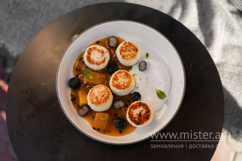 Ніжні сирники з цедрою лайму, кокосовими вершками, з додаванням пюре манго та маракуї, карамелізованами шматочками свіжого ананасу та м`ятою.