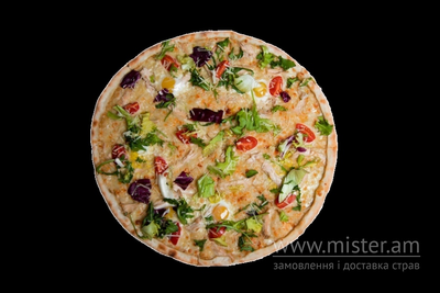 тісто, філе куряче, соус цезарь, сир моцарела, пармезан, яйця перепелині, мікс салатів, томати чері