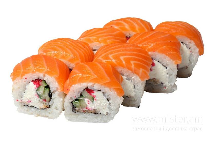сир філадельфія, огірок, вугор очищений, лосось, червона тобіка, васабі, імбир маринований