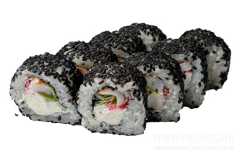 Кунжут чорний, норі, креветка, сир Філадельфія, ікра тобіко, айсберг, васабі, імбир, соус соєвий.