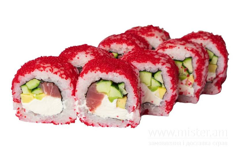 Норі, тунець, сир Філадельфія, ікра тобіко, авокадо, огірок, васабі, імбир, соус соєвий.