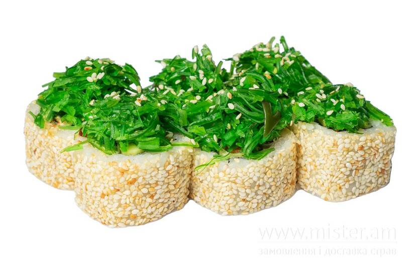 Норі, хіяші вакаме, огірок, кунжут, перець болгарский, айсберг, зелена цибуля, соус горіховий, васабі, імбир, соус соєвий.
