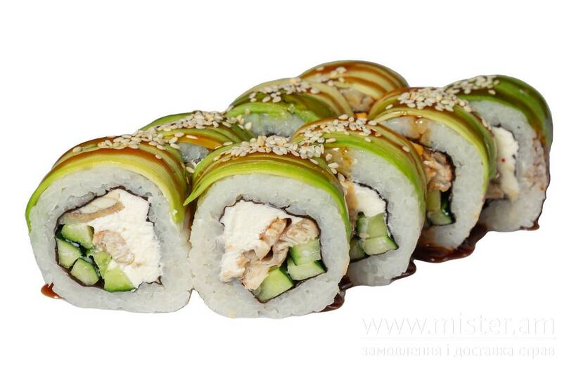 Норі, вугор, сир Філадельфія, огірок, авокадо, кунжут, соус унагі, васабі, імбир, соус соєвий.