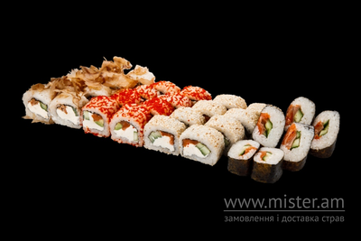 філадельфія з лососем в кунжуті, футумак лосось, філадельфія зі стружкою тунця, каліфорнія з лососем