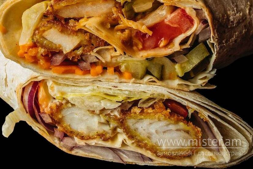 Айсберг, морква, помідор, цибуля, стріпси хека, соус халапеньо-майо.