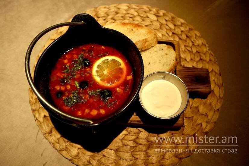 Куряче філе, ковбаски мисливські, підчеревина копчена, балик, цибуля, маринований огірок, оливки, лимон.