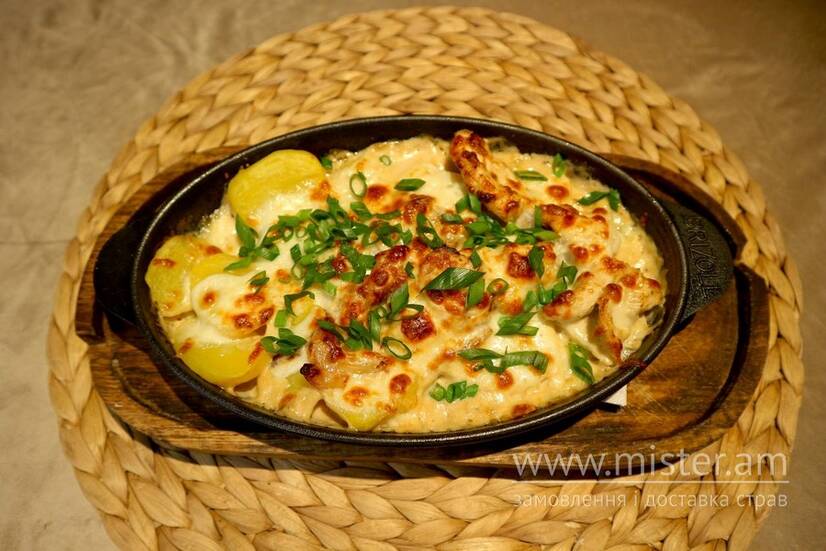 Куряче філе, картопля, вершки, цибуля, моцарела.