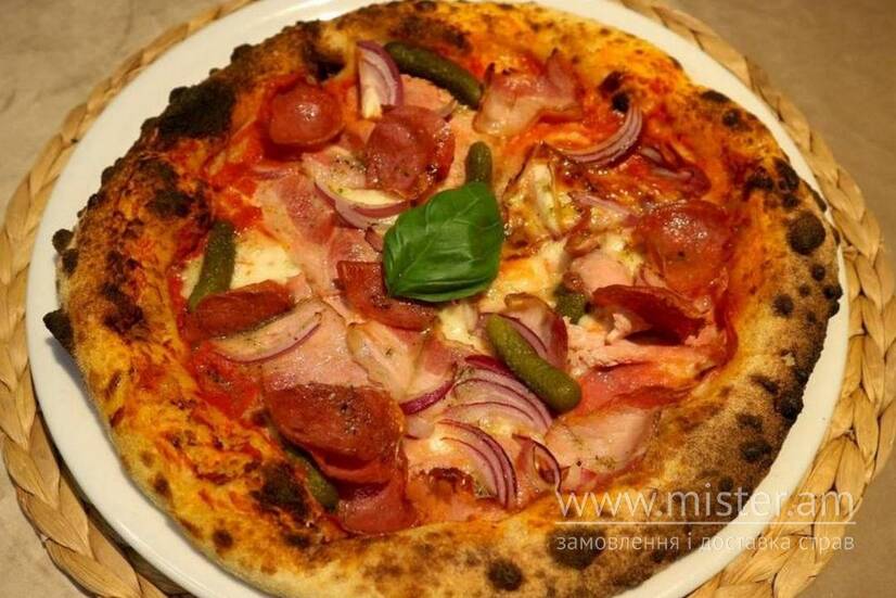 Томатний соус, сир моцарела, бекон, балик, салямі, синя цибуля, саламаха, корнішони.