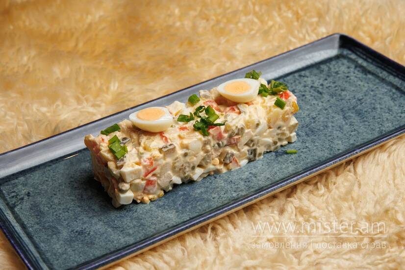 Куряче філе, морква, картопля, горошок, цибуля зелена, яйце, огірок солоний, майонез.