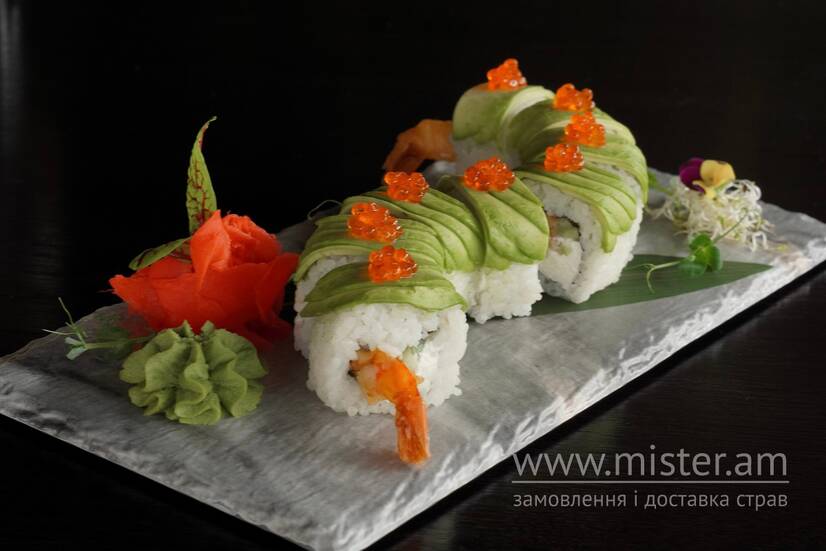 Вугор, крем-сир, авокадо, соус унагі, лососева ікра.