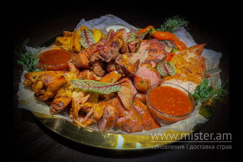 cвина костиця, вирізка свина, свині ребра, філе індиче, ковбаски, шашлик яловичий, картопля запечена, подається з трьома соусами