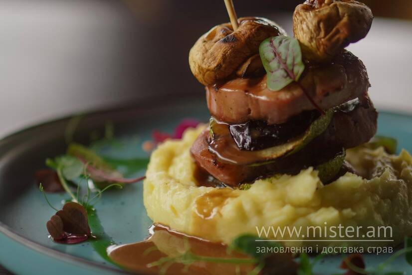 Свинна вирізка, кабачки, печериці, баклажан, соус Деміглас, картопляне пюре.