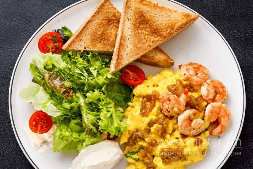 Ніжний скрембл з креветкою, крем-сиром та грінкою хліба.