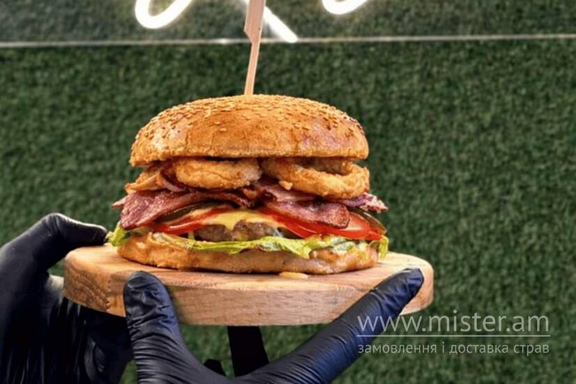 Булочка, яловича котлета, бекон, цибулеві кільця у фритюрі, сир чедер, маринований огірок, помідор, соус BBQ, соус сирний.