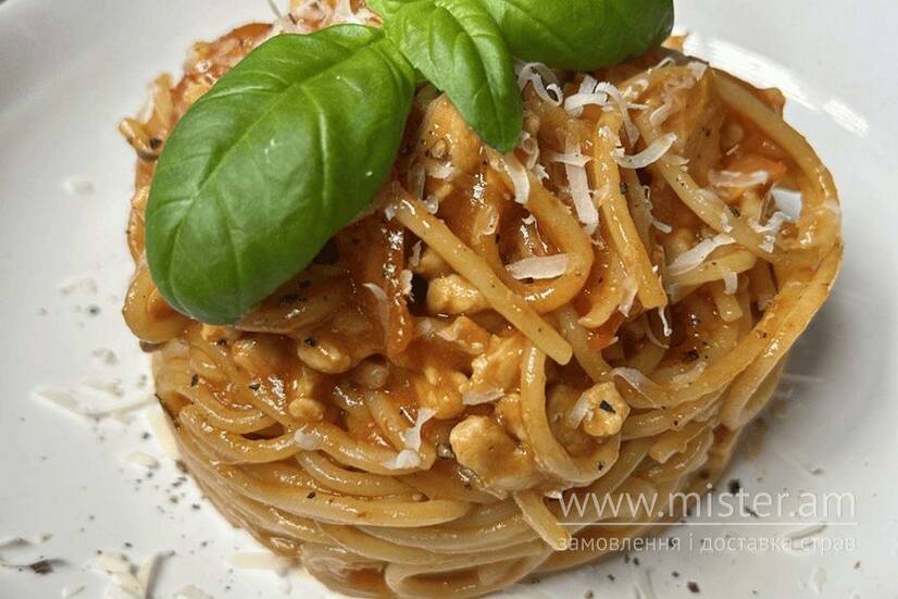 Паста, томатний соус, курка, помідори, цибуля, часник, пармезан.