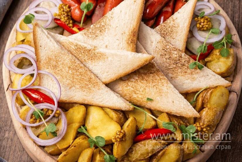 Ковбаски мисливські, картопля по-селянськи, солоні огірки, хлібчик.