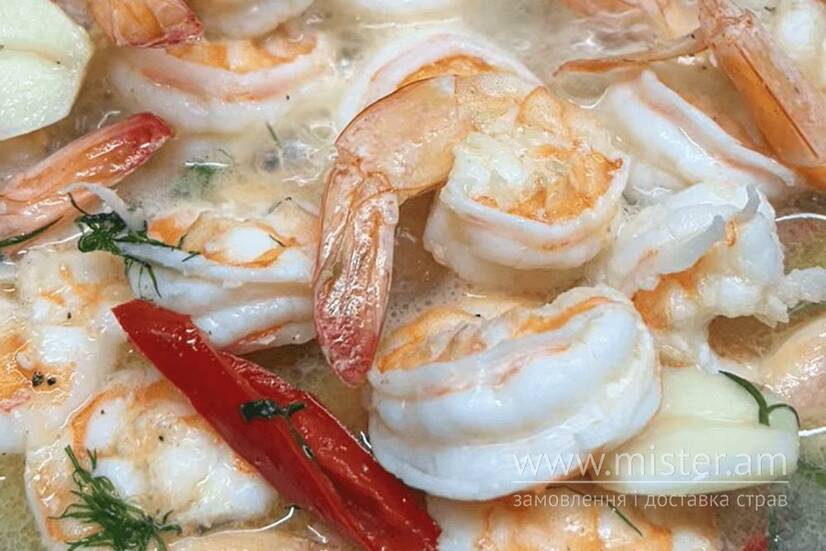 Креветки тигрові, вершкове масло, чилі, зелень.