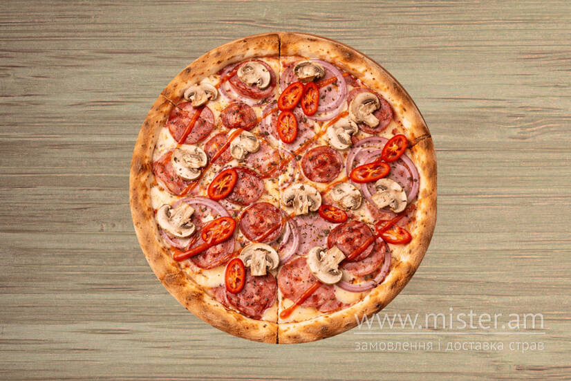 Томатний соус, моцарела, салямі, мисливські ковбаски, печериці, цибуля, перець чилі, гострий соус.