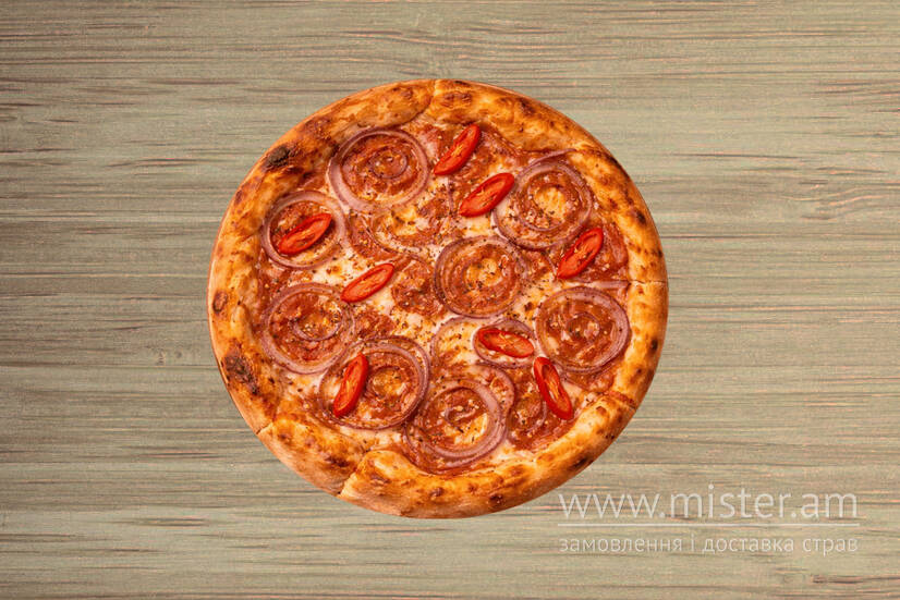 Томатний соус, моцарела, цибуля, гострий соус, перець чилі, карі, орегано.