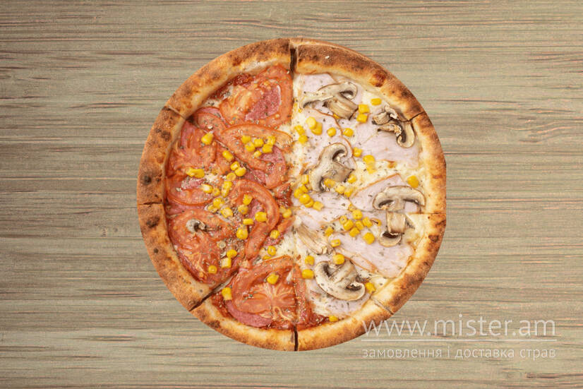Томатний/вершковий соус, моцарела, салямі, курка копчена, печериці, кукурудза.
