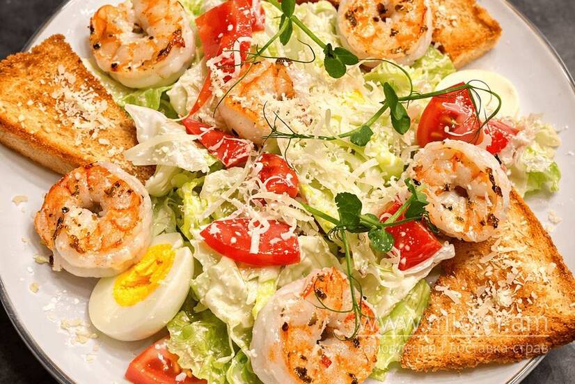 Листя салату, креветки тигрові, яйце перепелине, помідори, пармезан, соус Цезар.