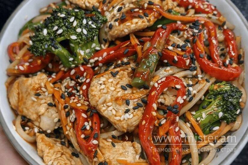Локшина, курка, морква, цибуля, болгарський перець, перець чилі, броколі, гострий соус, теріякі, кунжут.