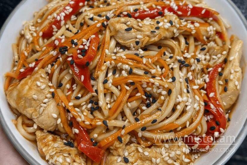 Локшина удон, курка, болгарський перець, морква, кисло-солодкий соус, цибуля, кунжут.