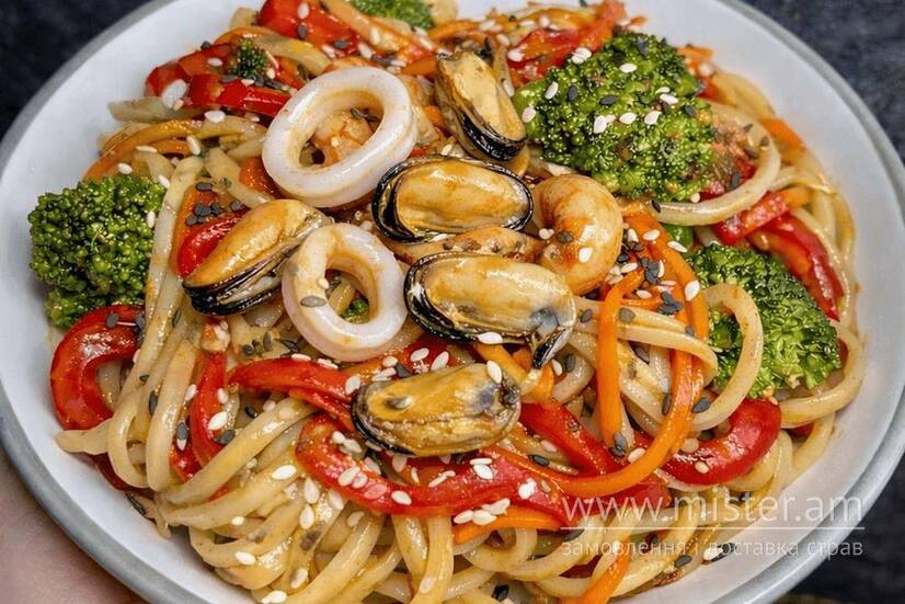 Локшина, морський мікс, болгарський перець, морква, цибуля, броколі, соус теріякі, зелень, кунжут.